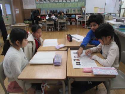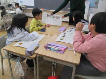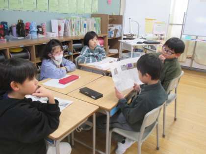 12月23日(月)2・3年生 国語 公開日 2024/12/23 更新日 2024/12/23 2年 2年生は「おもちゃの作り方」3年生は「食べ物のひみつ」について説明文を書きました。今日は、2・3年生のグループになって読み合っています。友達の説明文をよく聞いて、質問したり感想を伝えたりしています。
