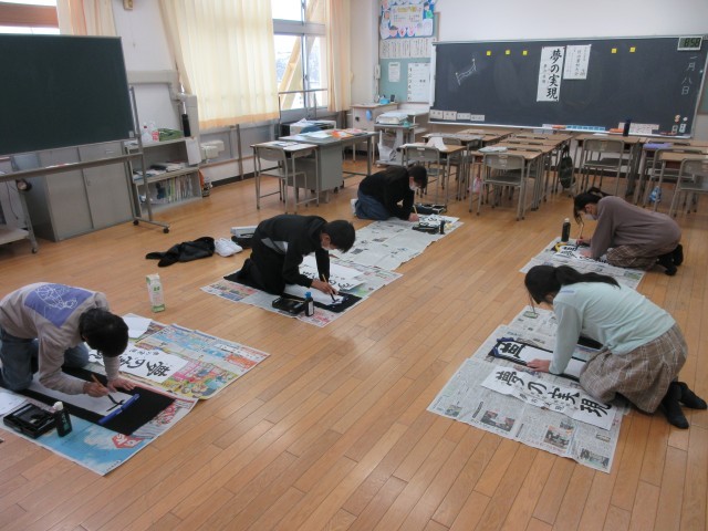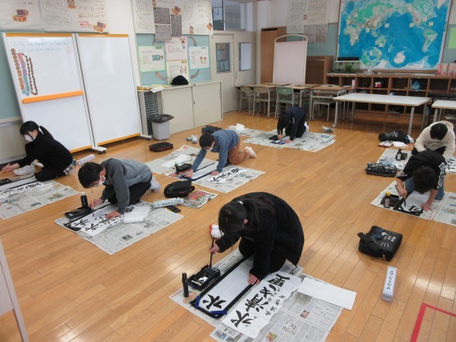 文字の大きさや組み立てに気をつけて、集中して書き上げました。「はらいがうまくいった」「バランスよく書けた」等、以前の自分の作品と比べながら作品を鑑賞しました。それぞれ気持ちを込め、新年にふさわしい作品に仕上がりました。