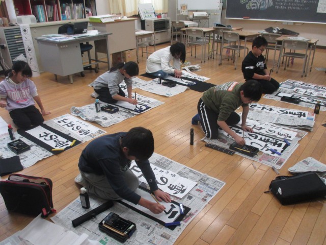 始業式後には、書初大会が行われました。1画ずつ手本をよく見て書きました。