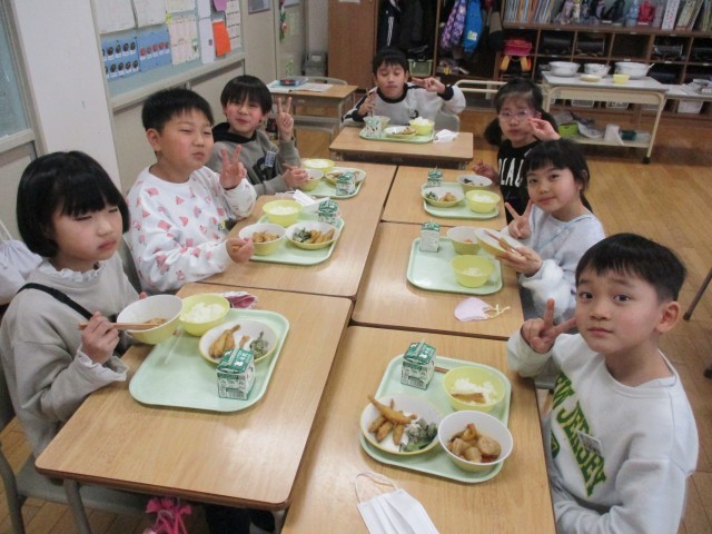 3学期の給食が始まりました。グループごとに楽しく会話をしながらいただきました。準備や片付けも当番の人たちで協力して進めていました。
