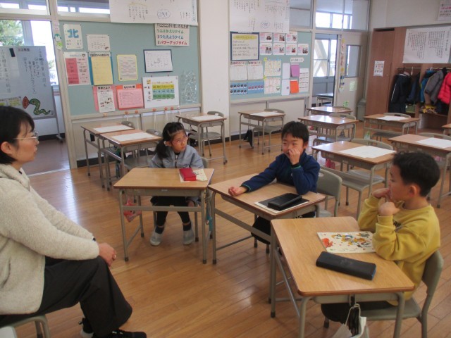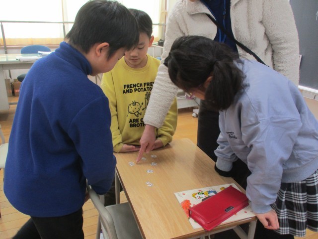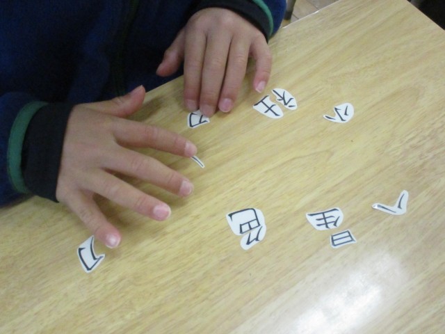 書写の時間の様子です。担当の先生と一緒に、冬休みの思い出を伝え合っていました。その後は、先生手作りの漢字パズルに挑戦です。今までに覚えた漢字を一生懸命に思い出しながら取り組みました。