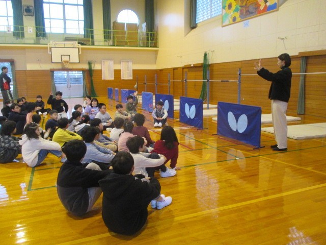 4分間走の後に、先週設置された鉄棒や卓球台の使用について話を聞き、約束を確かめました。