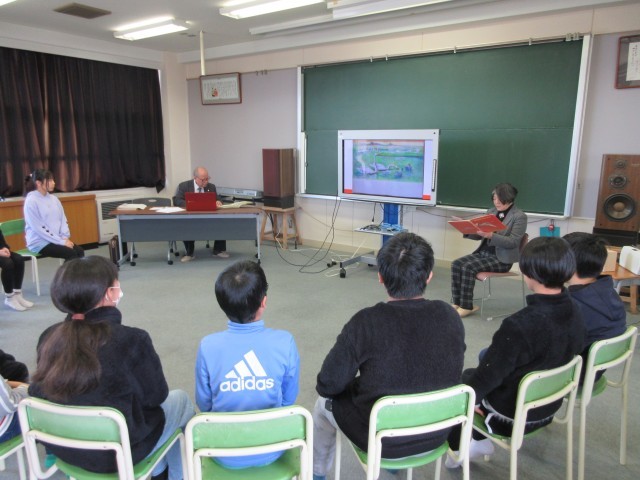 60年前に栃谷の大沢池に飛来した白鳥を心を込めてお世話した古沢小学校の大先輩、当時の様子を取材しマイクルポ「村の子らと白鳥」を制作された小杉高校放送部OBの方々、絵本「コーリャよ はばたけ」の作者である井口文秀氏を研究していらっしゃる方をお迎えして、当時のお話を伺ったり、絵本の読み聞かせをしていただいたりしました。