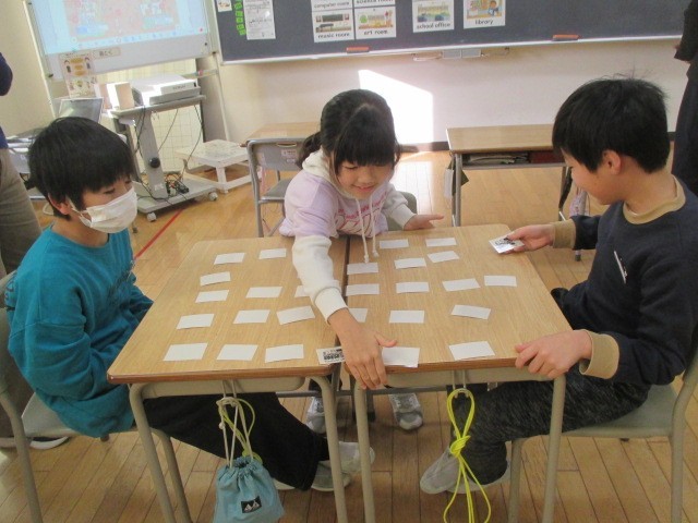 今日は、英語専科の先生お手製の神経衰弱形式のカードゲームを楽しみながら、部屋の名前を発音練習をしていました。