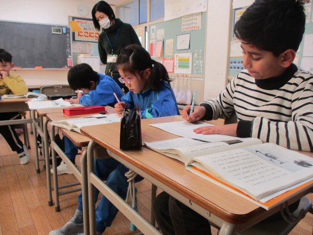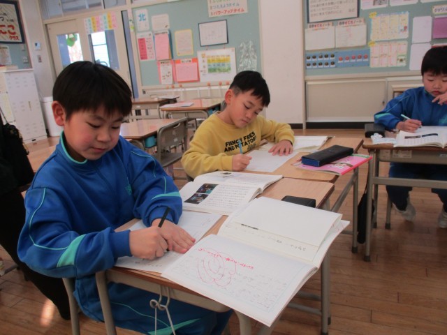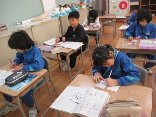 2年生は説明文の学習をしています。大事な言葉を見つけながら集中してワークシートに書き写しています。3年生は音訓カルタ作りです。できあがったカルタで遊ぶのが楽しみですね。
