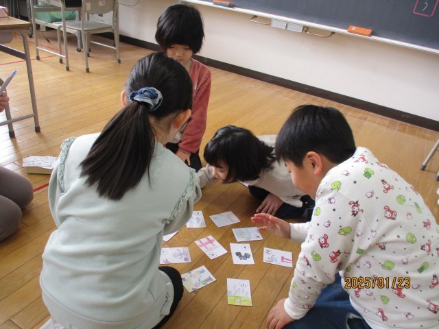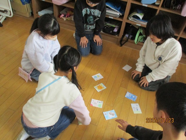 漢字の「音読み・訓読み」の学習を生かして「音訓カルタ」を作りました。今日は作ったカルタで大会をしました。友達が作った文を集中して聞きながら楽しみました。