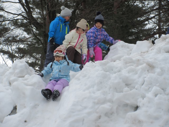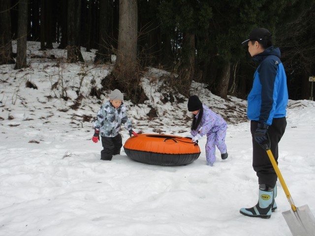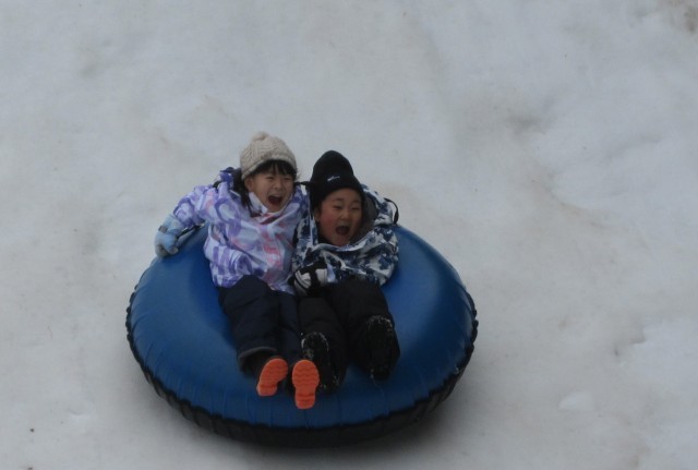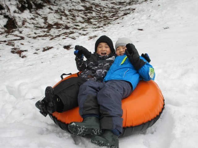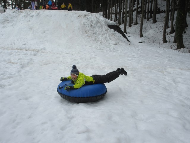 1、2、3年生は富山市子どもの村で雪遊びをしました。まずは、チューブそり滑りです。坂道コースを何度も滑って楽しみました。迫力満点のコースでしたね。