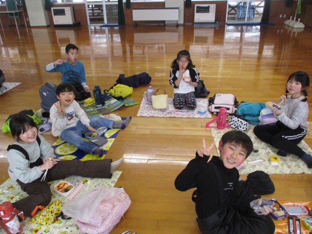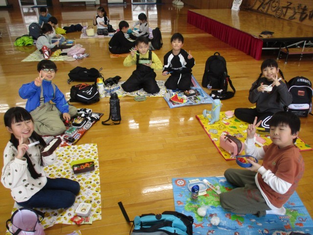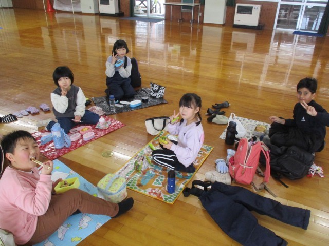 昼食の様子です。午前中にたくさん体を動かしていたので、おいしいお弁当で午後の活動へのパワーをつけることができました。グループで楽しく話をしながらいただきました。保護者のみなさま、準備をしていただき、ありがとうございました。