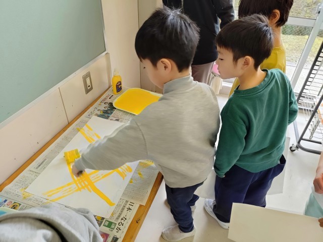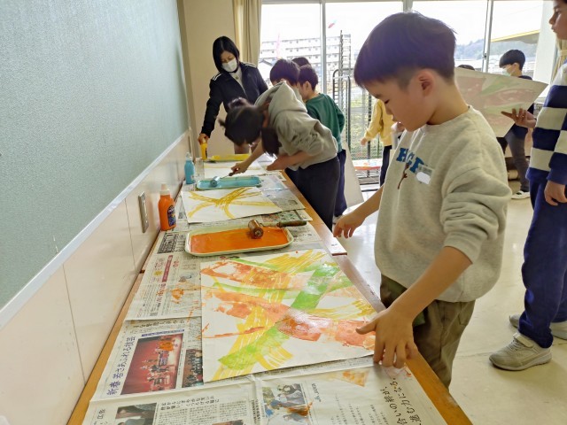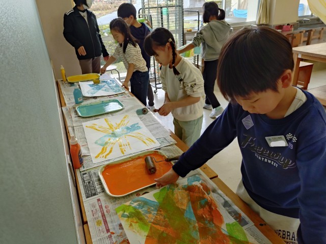 1、2年生は図工で「シールローラー版画」にチャレンジしています。今日はローラーを使っていちばん下の色づけです。たくさんの色の中から、自分の作品のイメージに合う色を選びながら色をつけました。どんな作品ができるのか楽しみです。
