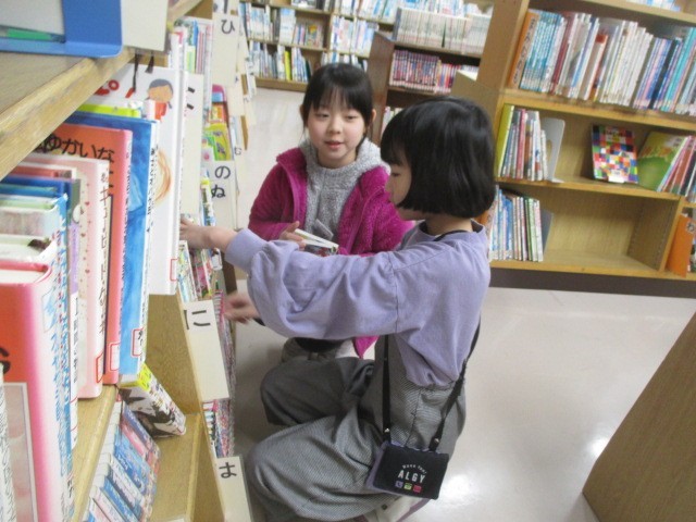 子供たちは、興味のある本や読みたいシリーズ本を探して借りています。
