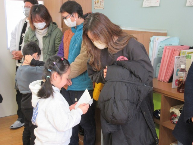 1月15日に生活科の学習「めざせ!にこにこかぞく~いえのしごとにチャレンジ~」をスタートしました。子供たちは、約3週間家の人をにこにこにすることを目指して家の仕事にチャレンジしてきました。今日の学習参観では、がんばったことや気付いたことを伝え合い、活動を振り返った後、家の人に手紙を書いて渡したり、家の人と話したりしました。子供たちは、この学習を通して、家の仕事の大変さに気付き、家族への感謝の気持ちを高めました。