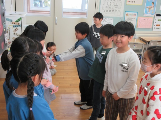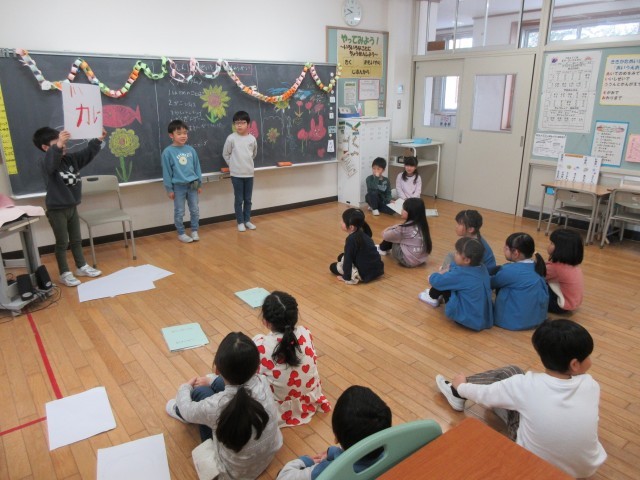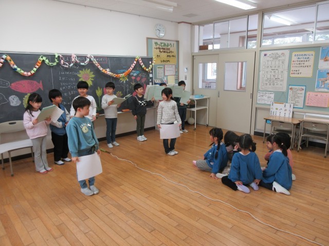 2月18日(火)に、来年度入学予定の児童が来校し、1年生と交流しました。古沢小学校のことを知ってもらおうと○×クイズをしたり、1年生の子供たちが選んだ遊びを一緒にしたりしました。1年生の子供たちは、年長児が楽しめる集会になるように準備し、当日は声をかけながら楽しく交流することができました。集会後に振り返りをすると、たくさん練習をすることや失敗を次に生かすことの大切さに気付いた子供もいて、1年生にもよい学びとなりました。