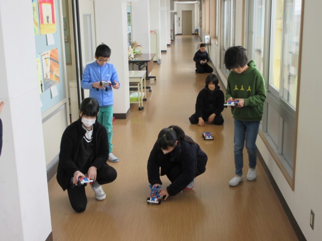 今日は電磁石の性質の復習をした後、以前に作った電磁石を利用した自動車でみんなで競走をしました。