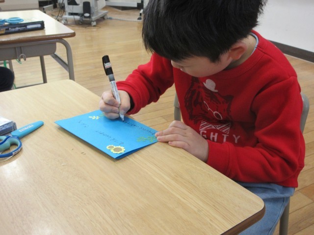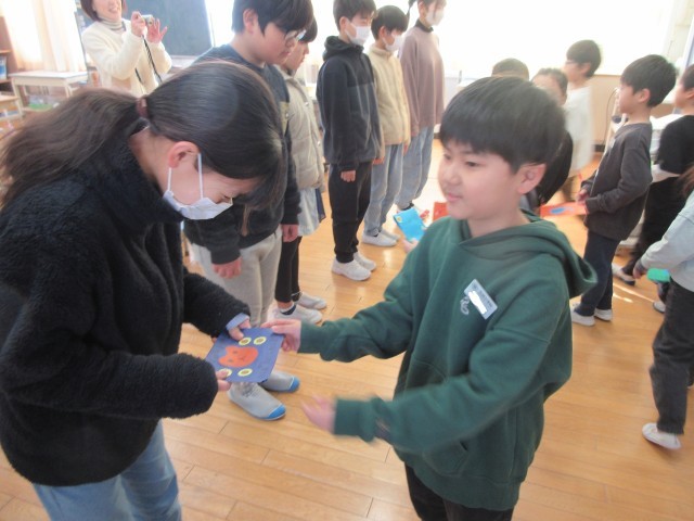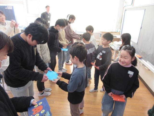 2月25日(火)の朝、1年生は、来週行われる卒業を祝う集会への招待状を6年生に渡しました。先週、6年生への感謝の気持ちを込めて、飛び出すメッセージカードを作り、集会の日時と場所、メッセージを書いて、かざりをつけて仕上げました。招待状をもらった6年生は、嬉しそうに見えました。