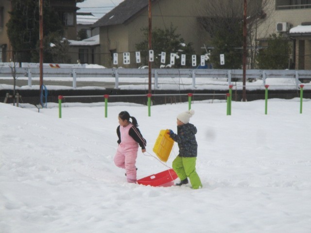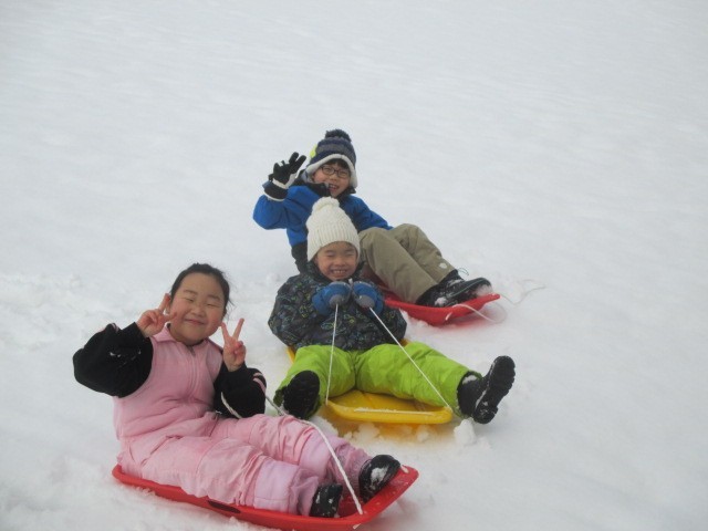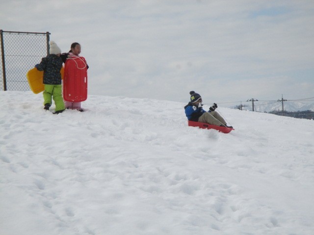 大休憩にグラウンドでそり滑りをしている1年生。寒さに負けず、とっても楽しそうです。