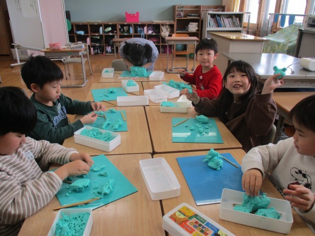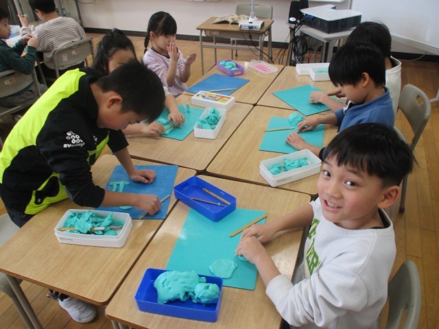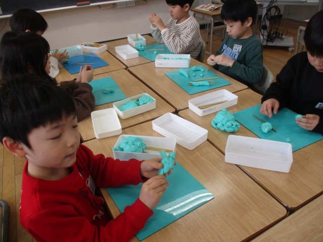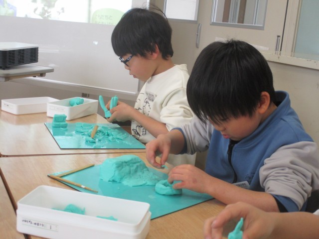 「おもいでをかたちに」の学習をしています。1年間の思い出を振り返り、印象にのこっている場面を粘土であらわしています。どのような作品ができるのか楽しみです。