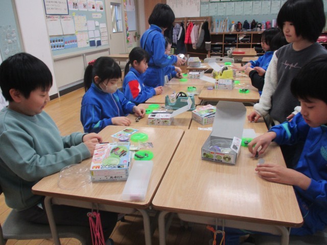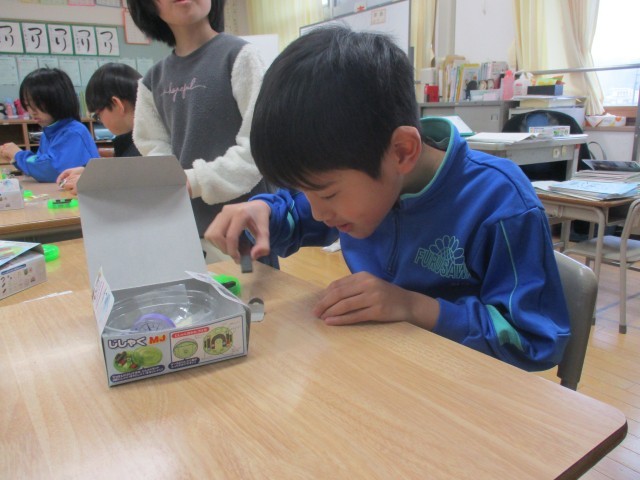 じしゃくを使ったおもちゃ作りをしています。これまでの学習内容から、磁石のどのような性質を使ったおもちゃなのかを考えながら、楽しんで活動することができました。