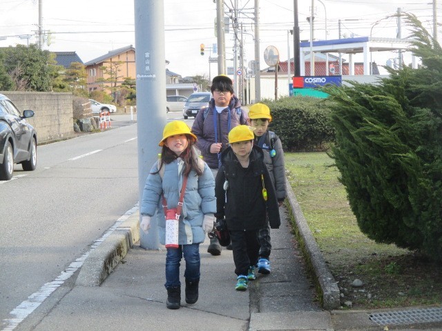 今日は、朝から日が差す気持ちのよい日です。集団登校では、新しく決まった副班長が先頭になり安全に気を付けて歩いています。