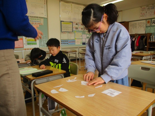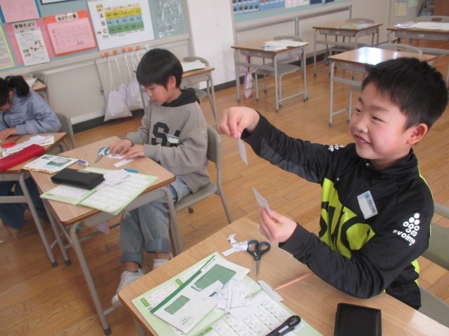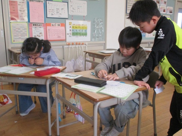 書写では、1年間のまとめとして、漢字パズル作りに取り組んでいます。これまでに学習した字の形を確かめながらパズルを作り、問題を出し合っています。今日は、1年生に向けて出題する漢字パズル作りに励んでいました。