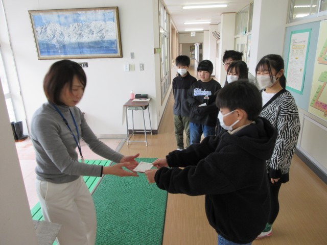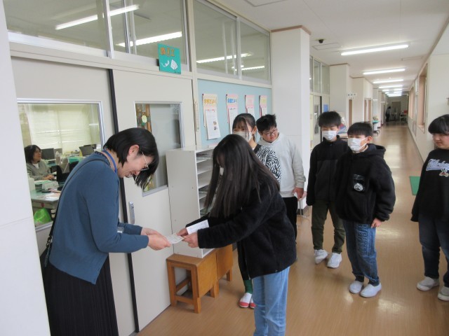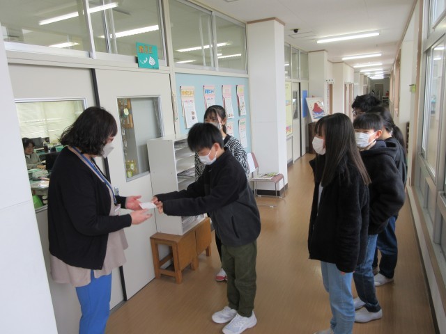 6年生は卒業企画で、お世話になった先生や職員のみなさんに感謝の気持ちを伝えに行きました。今まで色々なことを教えていただいたり、見守っていただいたりした一人一人の教職員のみなさんに手紙を書き、お礼の気持ちを添えて渡しました。教職員のみなさん、本当にありがとうございました。