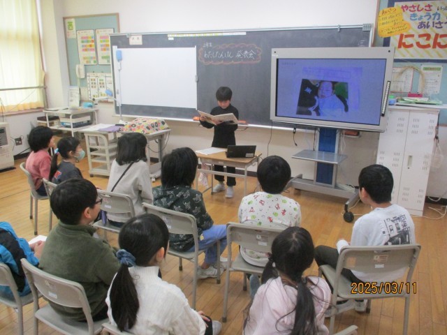 生活科で「自分たんけん」の学習を進めてきました。2年生でがんばったことやできるようになったことを振り返ったり、生まれたときや小さかったときの様子を家の人にインタビューしたりしながら、自分の成長について考えてきました。今日は、学習のまとめとして、自分の成長をスライドをつかって発表しました。聞いていた3年生のみんなからもたくさんの感想をもらうことができました。保護者の皆様、インタビューや写真集めにご協力いただき、ありがとうございました。