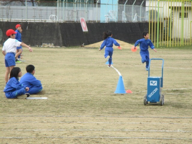 3・4年生は外で体育をしています。マーカーをゲットするために作戦を考え、みんな真剣に走っています。