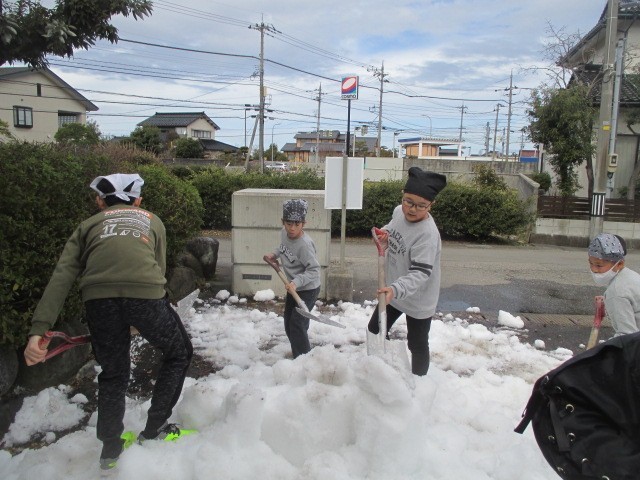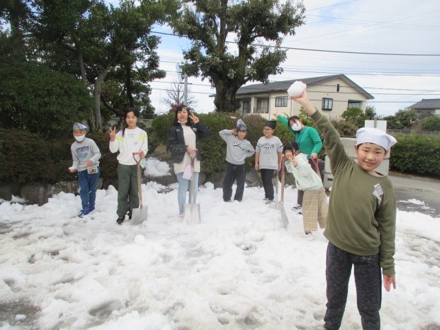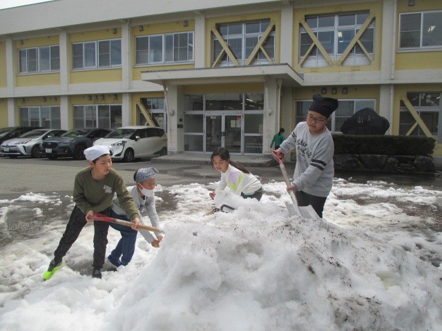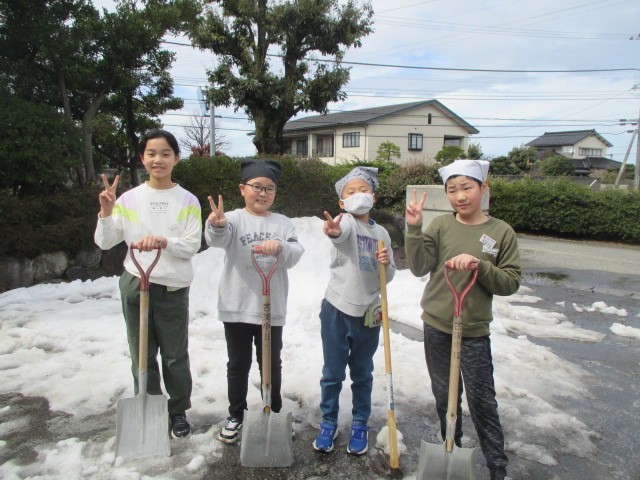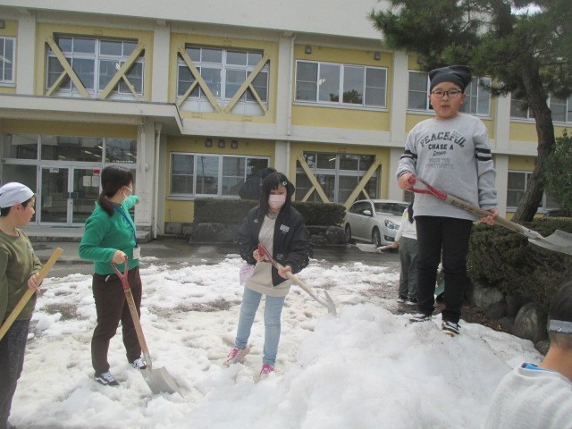 昼休みに4年生が雪山くずしを手伝ってくれました。みんなですると、あっという間に雪山がなくなりました。4年生さん、ありがとう。