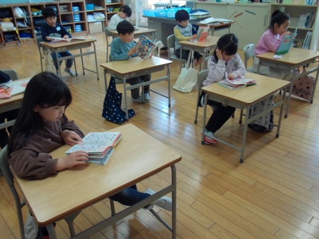 1年生は、担任の先生に読み聞かせをしてもらいました。2年生は、思い思いに好きな本を静かにじっくりと読んでいました。