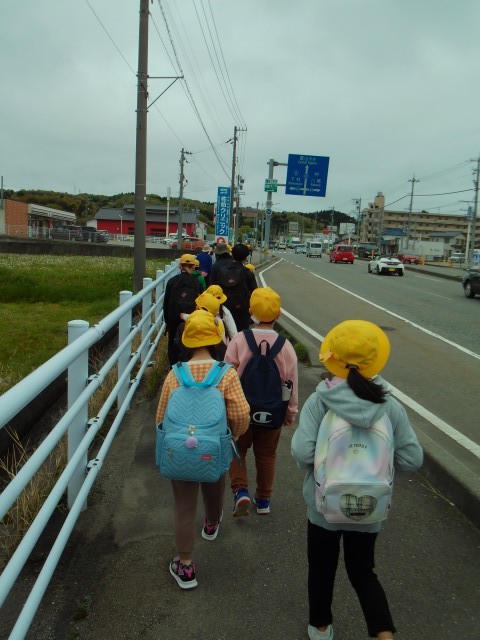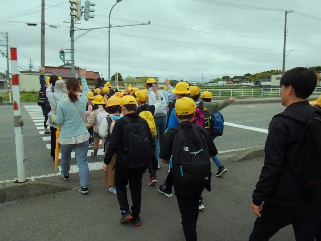 全校みんなで歩いて行きます。交通安全のルールを守り、元気に歩いて行ってきます!