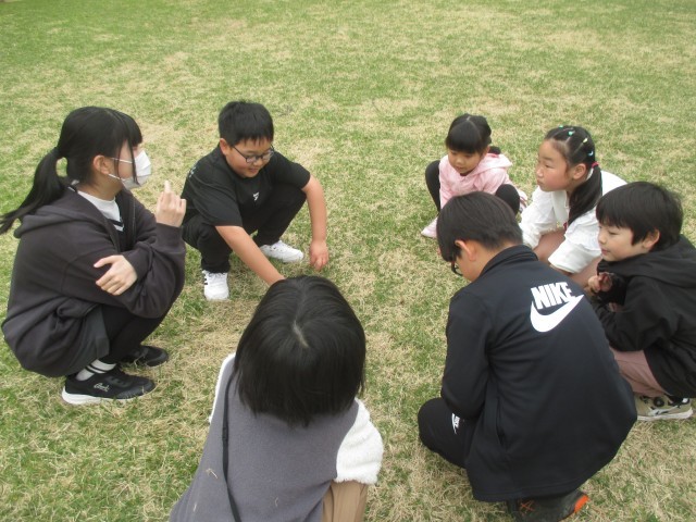 全校みんなで遊んだ後は、ファミリー班ごとに自己紹介をしたり、遊具で遊んだりしました。