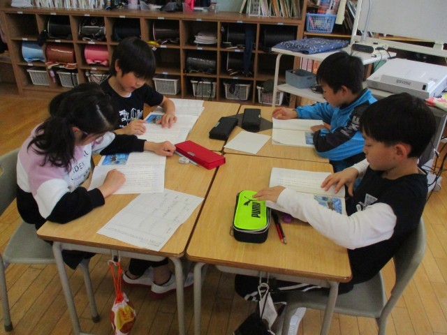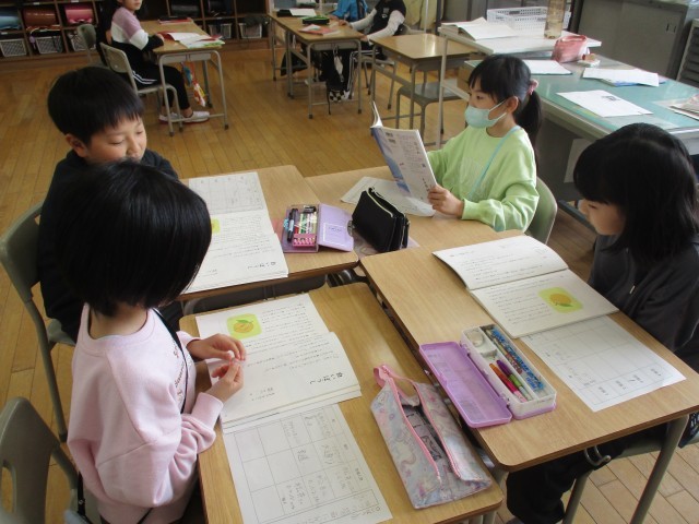 国語の学習では、それぞれの学年の物語文の読み取りをグループに分かれて進めています。みんなで音読をして内容を確認したり、不思議に思ったところを話し合ったりしながら、読みを深めていました。