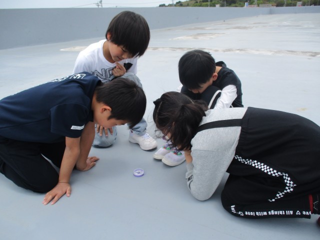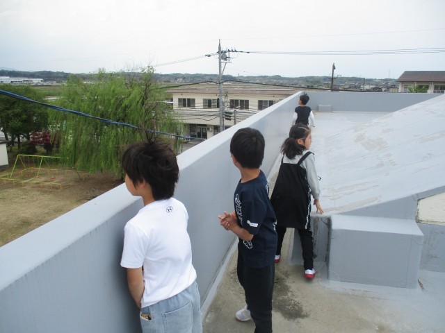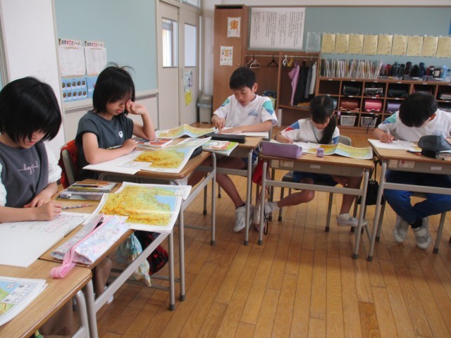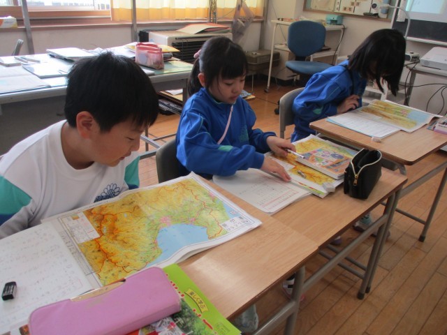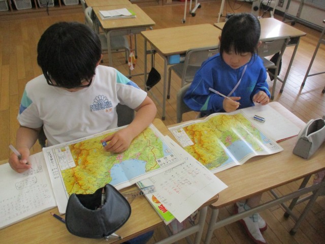 4年生は富山県の地図をじっくりと見て、気づいたことや疑問に思ったことなどをノートにまとめました。3年生は絵地図から東西南北の4つの方位があることを知りました。実際に屋上に行って学校の回りにある建物や自分の家はどの方位にあるのかを調べました。