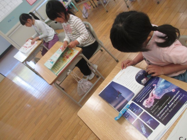 木曜日の給食後は読書タイムです。図書室で借りた本を真剣に読んだり、友達と話しながら一緒に読んだりと、読書に親しむ1年生です。