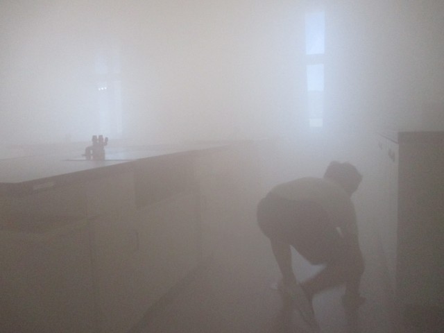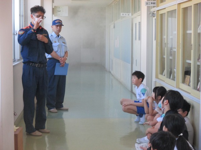 授与式後に、煙中体験をしました。実際に火事が起きたときには、部屋に煙が充満し、視界がほとんどなくなってしまいます。充満した部屋を一人ずつ歩いて、視界の悪さや息苦しさを体感し、「本当の火事のときはもっと怖いと思う」「逃げることが大切と知った」など感想を話していました。
