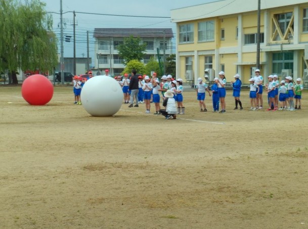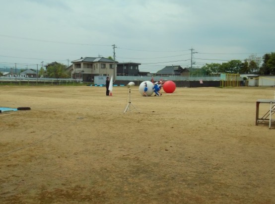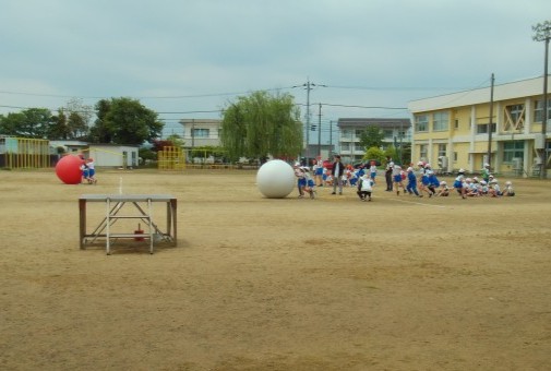 異学年3人ずつで転がし、コーンを回って次のグループに交代します。3人がいつも大玉に触れているというのがルールです。