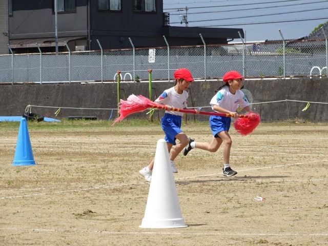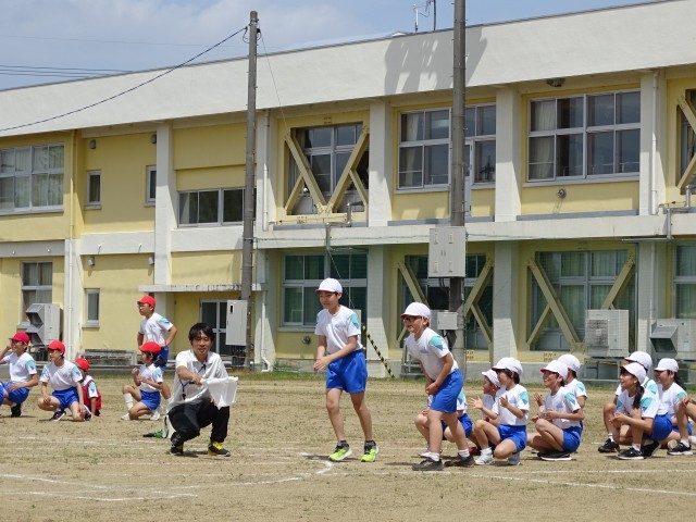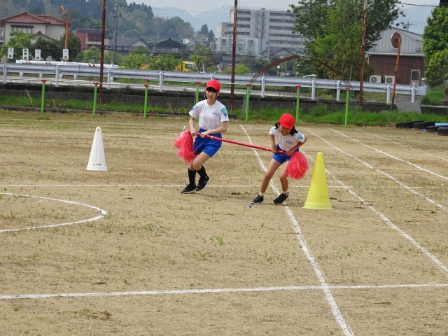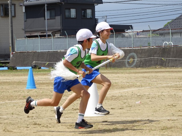 3、4、5、6年生で力を合わせて「台風の目」を行いました。棒の持ち方、コーンの回り方などに気を付けながら練習を重ねて来ました。今日はたくさんの応援の中、ペアで力を合わせて、全力で走り切ることができました。