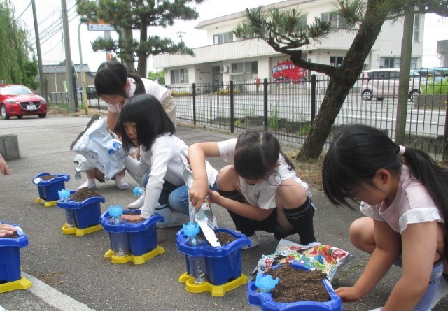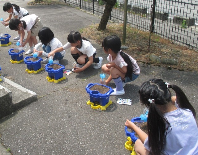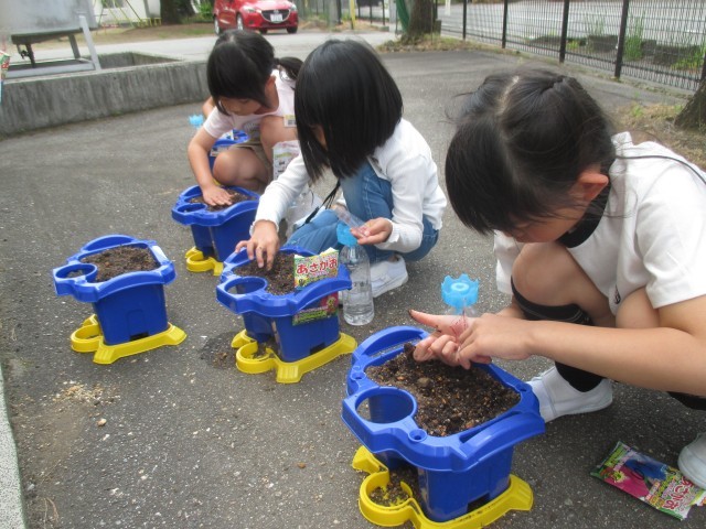 これから、生活科では朝顔を育てます。今日は種をまきました。「紫色の花がいいな」「葉っぱが出るのが楽しみだよ」とわくわくしながら話す子供たちでした。