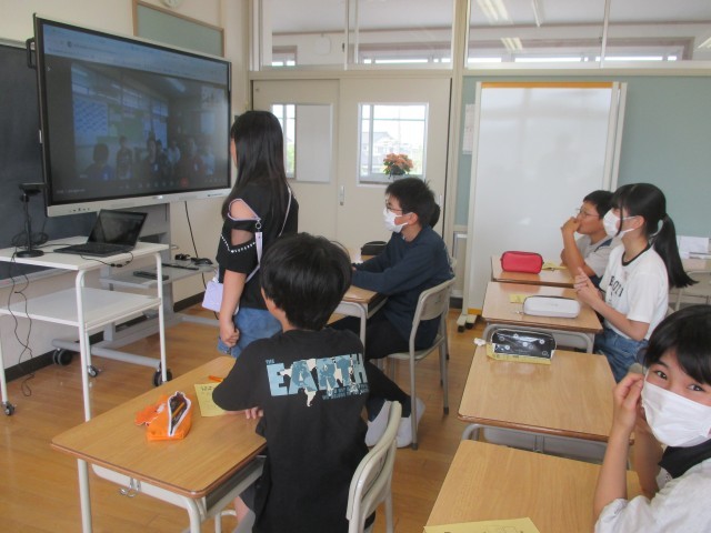 今日は、来週の校外学習で一緒に学ぶ池多小学校のみなさんとリモートで交流をしました。