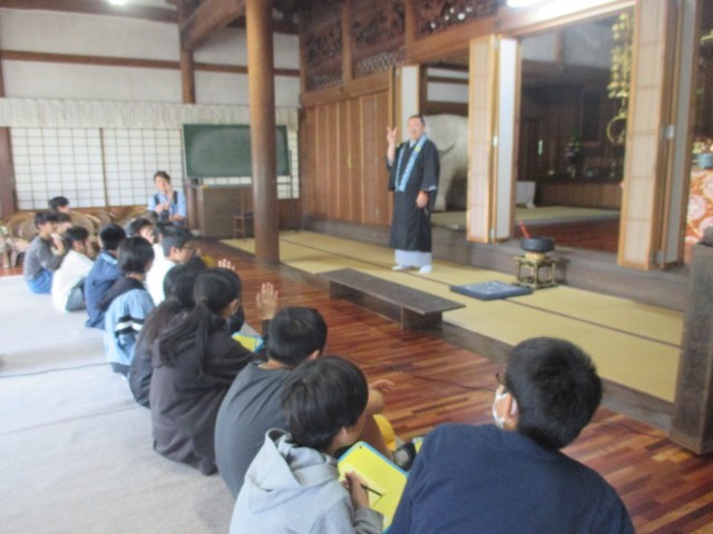 まず、池田地区にある楽円寺で学校の歴史や「ありがとう」の言葉の意味のお話を聞きました。自分自身を見つめ直すことや周りの人へ感謝することの大切さを学びました。