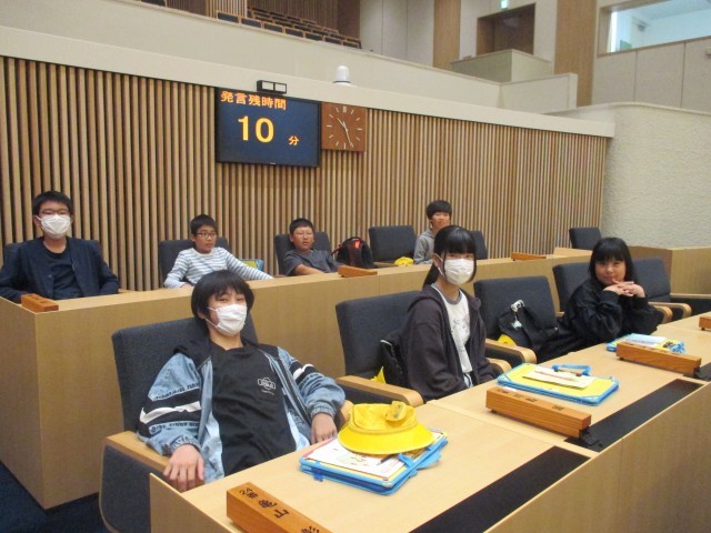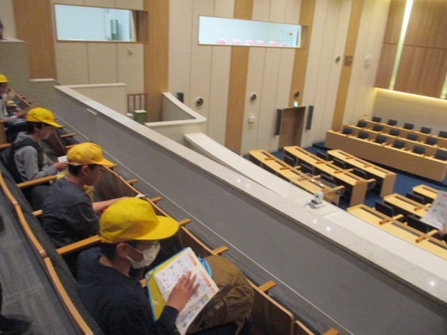 次に、富山県庁では、県議会の役割やしくみについて学びました。実際に本会議が行われている場所で、議長席や知事席にも座らせてもらいました。