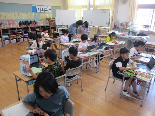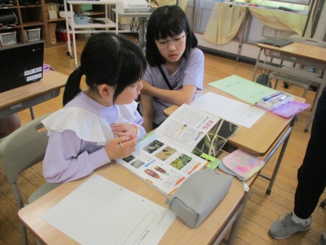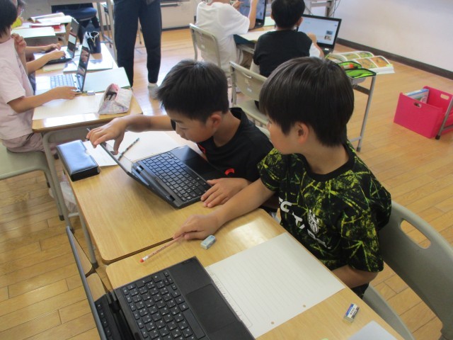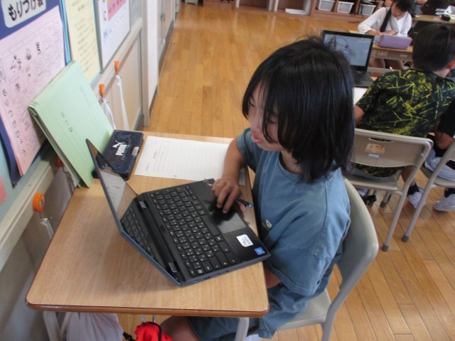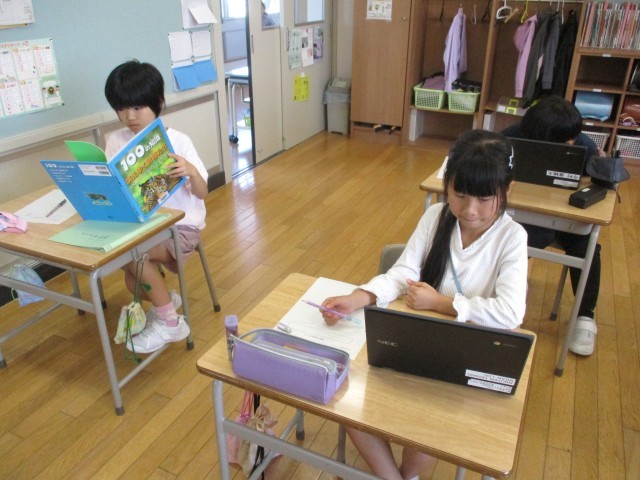 今日は一人一人が決めたテーマについて調べ学習をしました。ホクリクサンショウウオのこと、ホタルのこと、絶滅危惧種のことなど、自分の関心があることを、本やホームページで調べていました。次の時間に、どのようなことが分かったか伝え合います。
