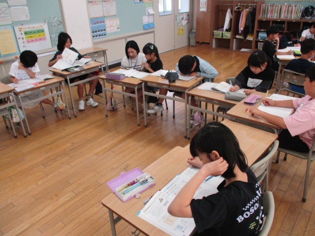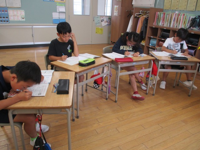 3年生は「3桁の筆算」、4年生は「わり算の筆算」の学習をしています。前時までの学習を生かして、集中して練習問題に取り組んでいました。