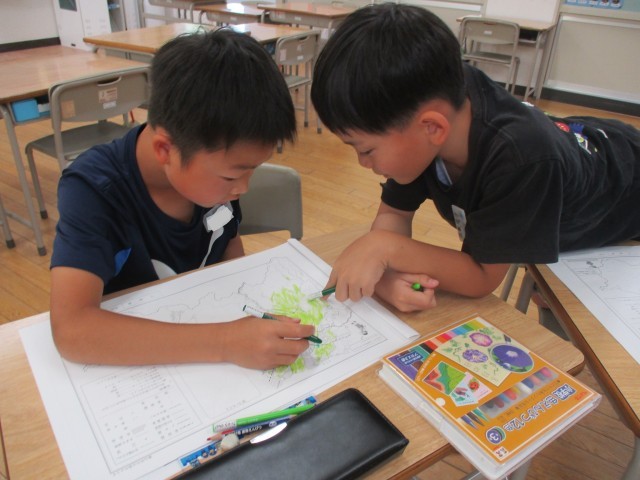 白地図を使って、富山市の土地利用の様子を調べました。東西南北など、これまでの学習を生かして、考えることができました。