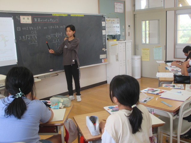 5年生算数科では、小数÷小数の筆算の方法について考えています。困っている友達がいると、声をかけ合いながら学習を進めています。