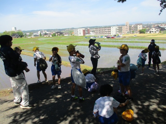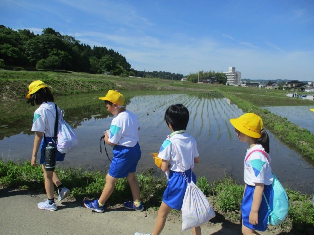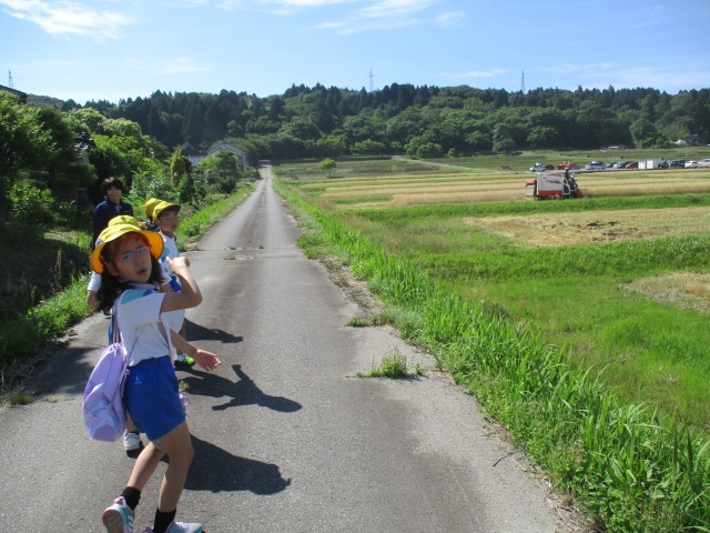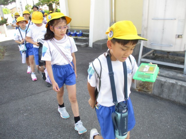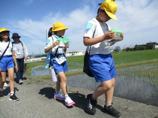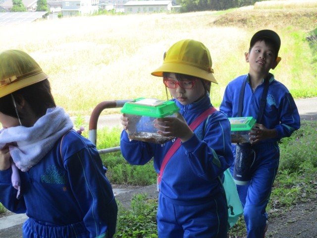 総合の学習で育てたホクリクサンショウウオを持ってひみつの森へ行き放流しました。道中はホクリクサンショウウオが入ってる容器を順番に持ち、見守りながら運びました。