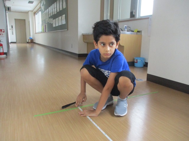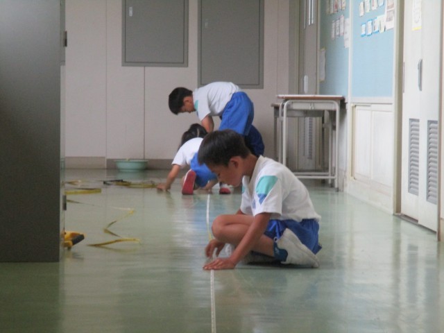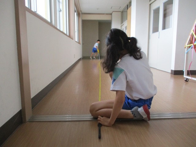 3年生は「長い長さ」の学習をしています。今日は教室の中や廊下の長さをまきじゃくを使って測りました。ペアの友達と協力しながら活動することができました。