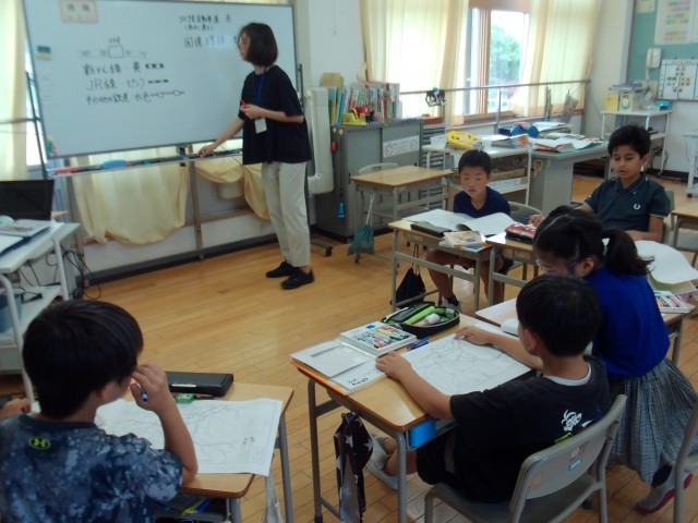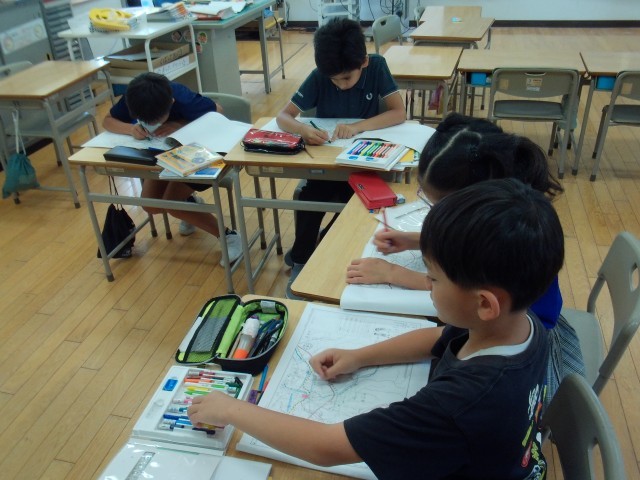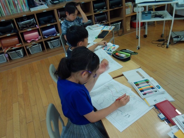 国道8号線や41号線等の大きな道路が、富山市のどこを通っているのかを白地図に色を分けて塗っていました。