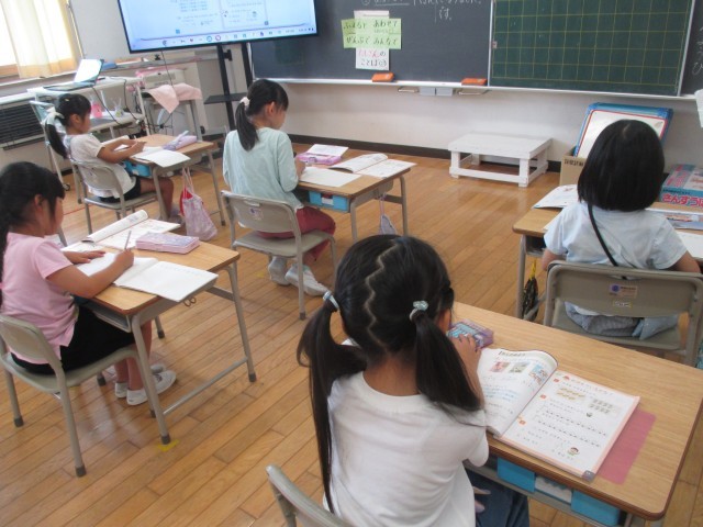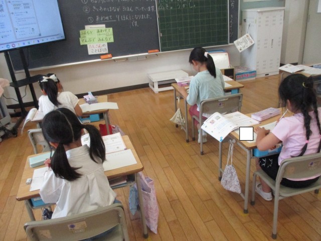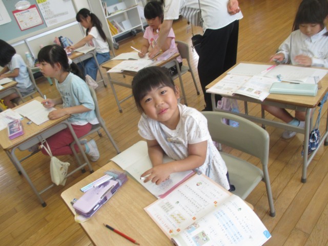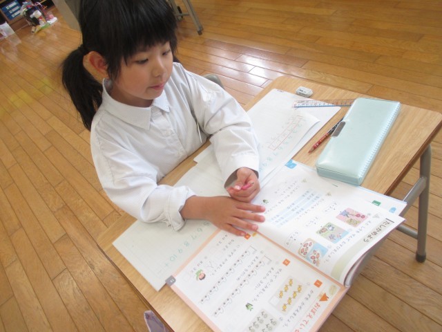 算数では、たし算の学習をしています。いつも集中して取り組んでいます。今日は、教科書の絵から「4+3=7」の式になるお話作りをしました。「あわせて」「ふえると」などのたし算の言葉を上手に使いながら、お話を作ることができていました。