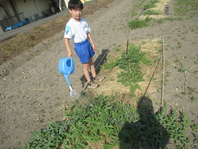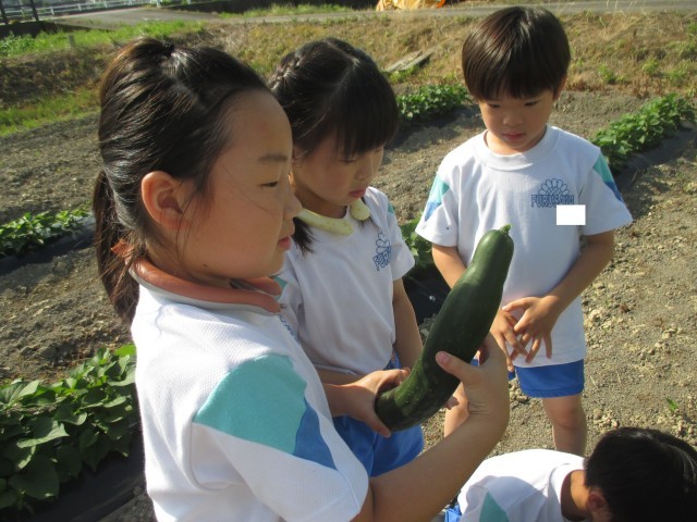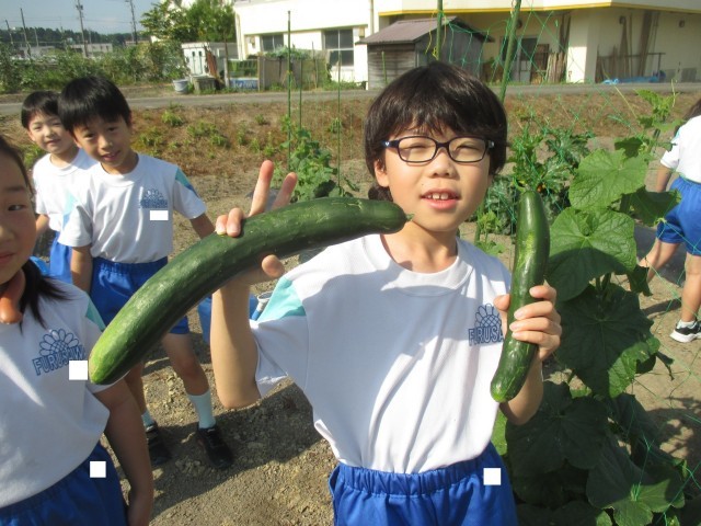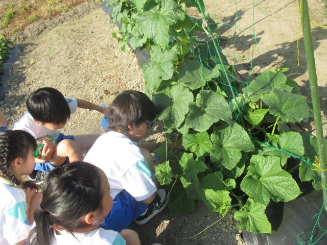 最近の暑さで、野菜もぐんぐん育っています。毎朝水やりに行く2年生は、少しの野菜の変化にも気付く観察名人です。きゅうりは初めて収穫することができました。他の野菜も収穫が楽しみですね。