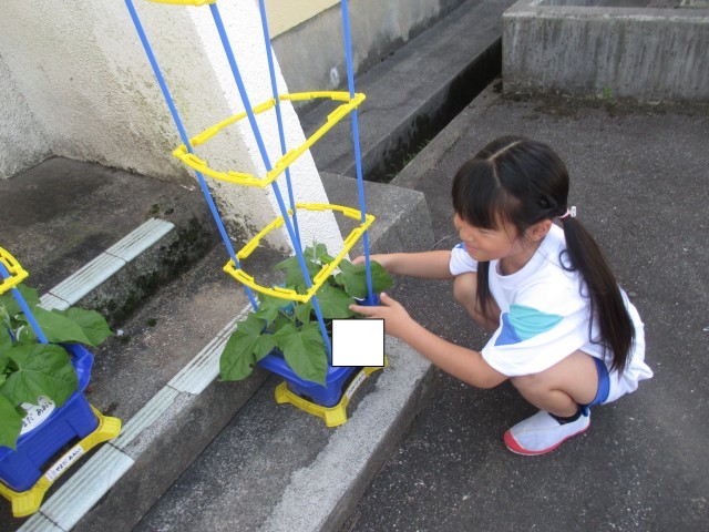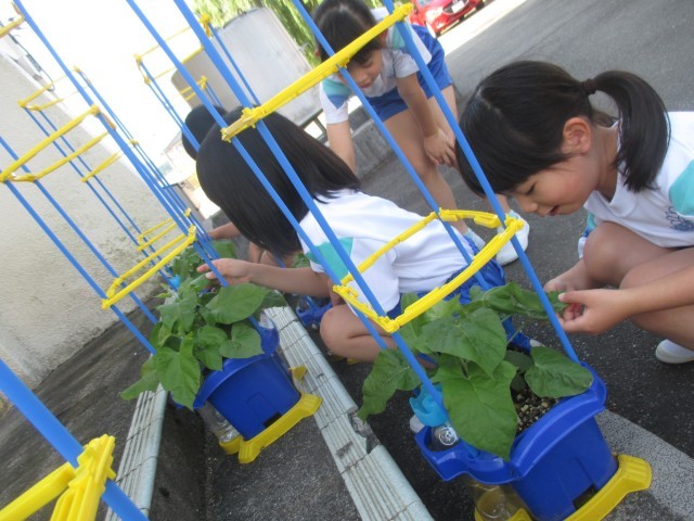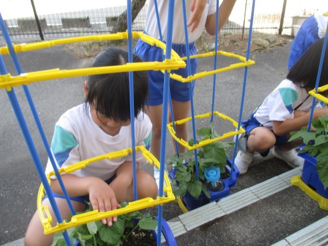 1年生は、朝の時間にあさがおに水やりをしています。葉と自分の手の大きさを比べたり、触ってさらさら、ざらざらな部分があることに気付いたりしています。また、先日の追肥が小さくなっていることにも気付き、「だから大きくなっているのか~」と考えていました。また、お休みの人の分も、水やりをしている優しい1年生です。